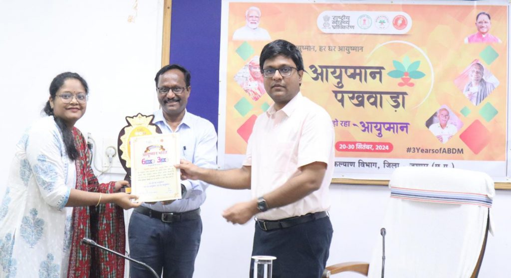 शुक्रवार को कलेक्टोरेट के सभा कक्ष में सम्मान समारोह का आयोजन किया गया जिसमें राज देवशरण जिला चिकित्सालय जशपुर को जिले में सर्वाधित हितग्राही 4772 को निःशुल्क लाभ प्रदाय करने पर प्रशस्ति पत्र एवं प्रतीक दिया गया जिसने प्रशस्ती पत्र प्राप्त करने के लिए डॉ० विपिन इन्द्रवार सिविल सर्जन सह मुख्य अस्पताल अधीक्षक, संदीप भगत नोडल अधिकारी आयुष्मान भारत जिला चिकित्सालय जशपुर श्रीमती हरावती सिंह मेडिको सुश्री रजनी सोनवानी आयुष्मान मित्र समुदायिक स्वास्थ्य केन्द्र दुलदुला को 726 हितग्राहियों का लाभ प्रदाय करने हेतु प्रशस्ती पत्र प्रदाय दिया गया डॉ . शोभा मिंज (विकास खंड चिकित्सा अधिकारी दुलदुला उपस्थित थे, सामुदायिक स्वास्थ्य केन्द्र मनोरा को 704 हितग्राहियों को लाभ प्रदाय करने पर प्रशस्ति पत्रक प्रदाय किया गया श्री आंनद लकड़ा विकासखण्ड कार्यक्रम प्रबंधक मनोरा प्राथमिक स्वास्थ्य केन्द्र छिछली जो अत्यंत कठिन एवं दूरस्थ स्थल में संचालित है उनके द्वारा 184 हितग्राहियों का आयुष्मान कार्ड बनाया गया है।