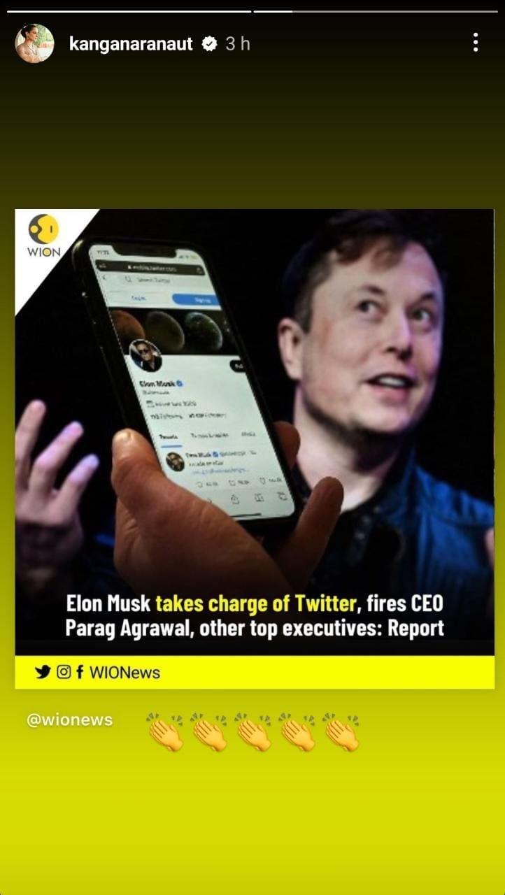 पोस्ट में लिखा था, ‘आशा है कि आपका ट्विटर अकाउंट भी जल्द ही बहाल हो जाएगा @kanganaranaut।’ इसके अलावा कंगना ने एक और पोस्ट शेयर किया है जिसमें न्यूज है कि एलन मास्क ने पराग अग्रवाल और दूसरे एक्जिक्यूटिव को हटा दिया है। इसपर कंगना ने ताली बजाने वाला इमोजी शेयर किया। जिससे जाहिर हुआ कि वो एलन को बधाई दे रही हैं।