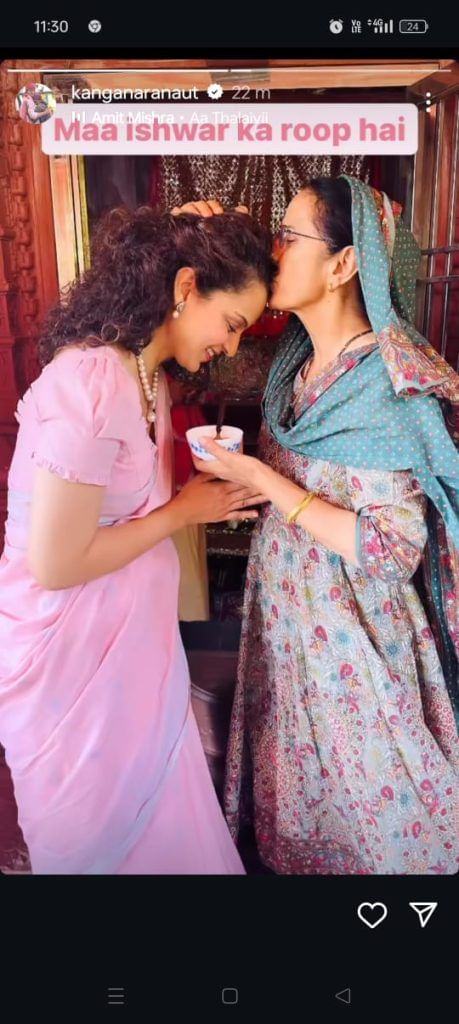 कंगना रनौत ने इंस्टा स्टोरी पर मां संग फोटो शेयर लिखा है- मां का आशीर्वाद. तस्वीर में कंगना की मां उन्हें मीठा खिलाती हुई दिख रही हैं.