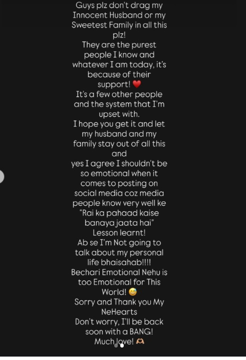 वहीं, इसके बाद नेहा कक्कड़ (Neha Kakkar) ने शादी को लेकर चल रही अटकलों और अफवाहों पर सफाई देते हुए लिखा, ‘दोस्तों, प्लीज मेरे निर्दोष पति और मेरे प्यारे परिवार को इसमें न घसीटें. वे मेरे जीवन के सबसे नेक लोग हैं और आज मैं जो कुछ भी हूं, उनके समर्थन की वजह से ही हूं. मैं कुछ अन्य लोगों और व्यवस्था से नाराज हूं. मुझे उम्मीद है कि आप मेरी बात समझेंगे और मेरे पति और परिवार को इस सब से दूर रखेंगे. हां, मैं मानती हूं कि सोशल मीडिया पर पोस्ट करते समय मुझे इतना भावुक नहीं होना चाहिए.’