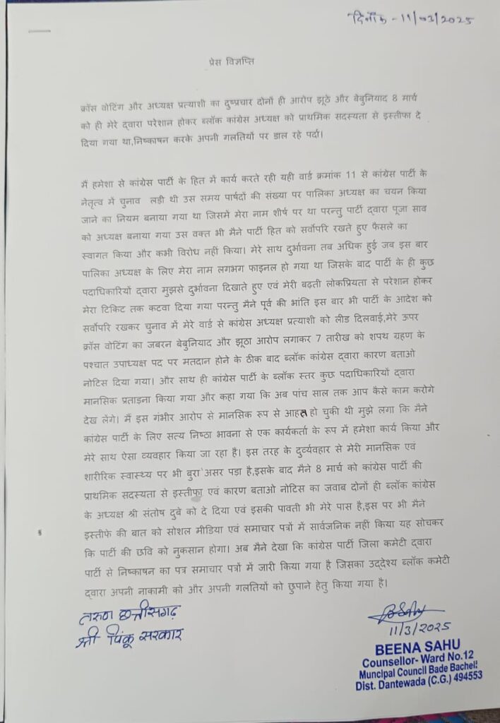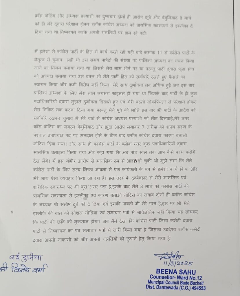 मुझे आज दिनांक 7-3-25 को कारण बताओं नोटिस जारी किया गया है जो कि सिर्फ मेरे को ही नोटिस किया जाना अत्यंत दुखद है मैं पार्टी के साथ दिए गए नोट नोटिस से बहुत आहत हूं मुझे बहुत आत्मज्ग्लानि है कि पार्टी सिर्फ और सिर्फ मुझे टारगेट किया गया मैं अपने वार्ड में एवं पार्टी की हर कार्य में आगे आकर काम करती रही हूं जिसका परिणाम भी मैंने पार्षद चुनाव में अच्छे से जीती हूं किंतु पार्टी के द्वारा एक ही व्यक्ति को नोटिस देना हर का ठीकरा देना कहीं ना कहीं मेरी भावनाओं को ठेस पहुंचा है अतः मैं पार्टी से अपने पद मुक्त होने की मांग करती हूं पार्टी मेरा इस्तीफा स्वीकार कर मुझे पद मुक्त करें यही मेरी प्रार्थना है धन्यवाद.
