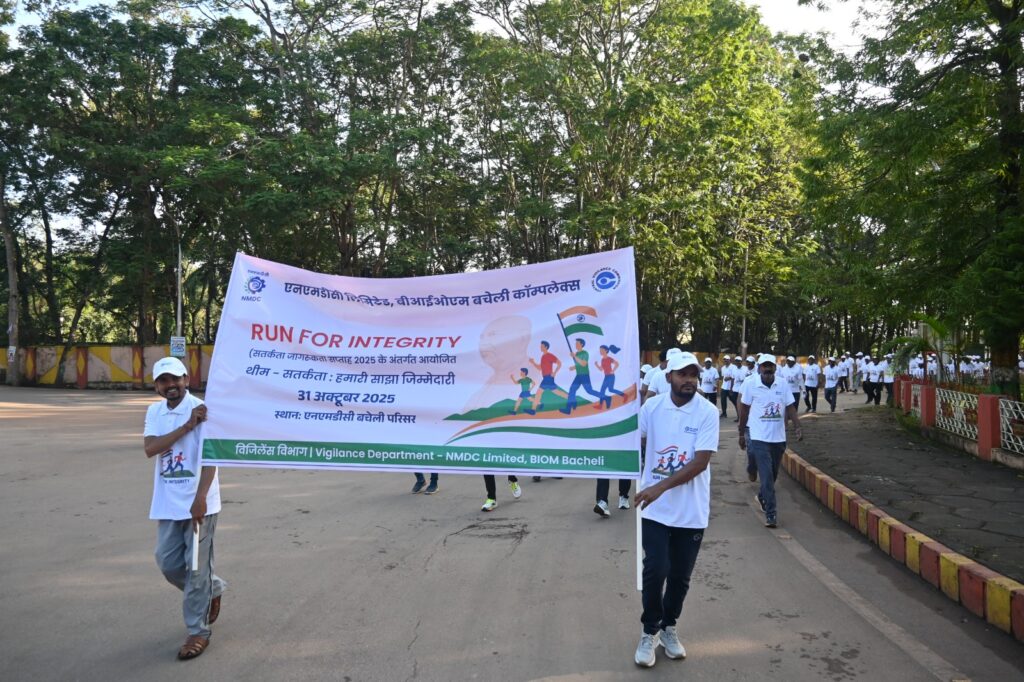 एनएमडीसी लिमिटेड के बीआईओएम बचेली कॉम्प्लेक्स में सतर्कता जागरूकता सप्ताह – 2025 के तहत 31 अक्टूबर 2025 (शुक्रवार) को “वॉक फॉर इंटीग्रिटी” का आयोजन किया गया। यह कार्यक्रम भारत के लौह पुरुष सरदार वल्लभभाई पटेल जी की जयंती के अवसर पर आयोजित किया गया, जिनकी स्मृति में यह दिवस राष्ट्रीय एकता दिवस के रूप में मनाया जाता है।